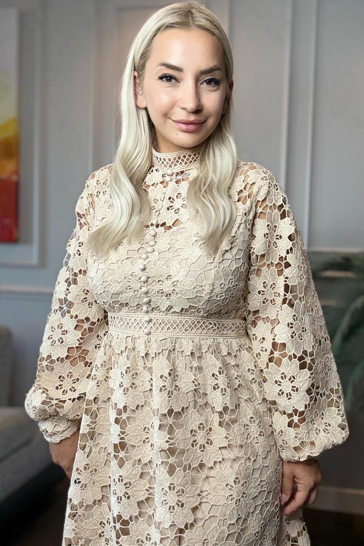 Bu bisiklet yaka elbise, dantel ve önden düğme detaylarının mükemmel uyumuyla feminen bir duruş sergiliyor. Krem renginin asil ve zarif tonuyla her ortamda dikkatleri üzerinize çekin. Doğal kumaşı sayesinde gün boyu rahatlık sağlayan bu elbiseyi topuklu ayakkabılarla veya sandaletlerle kombinleyerek farklı stiller yaratabilirsiniz.