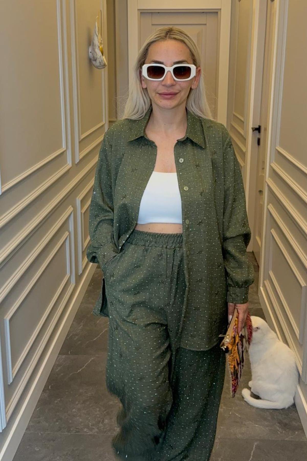Üst kısmında yer alan önden düğmeli tasarım, klasik şıklığı modern bir dokunuşla yeniden yorumlarken; nakış işlemeleri el emeğini ve zarif detayları ön plana çıkarır. Bu ince işleme detayları, takıma özgün bir karakter kazandırarak fark yaratır. Yeşilin huzur veren tonu ise hem enerjik hem de sofistike bir görünüm sağlar.