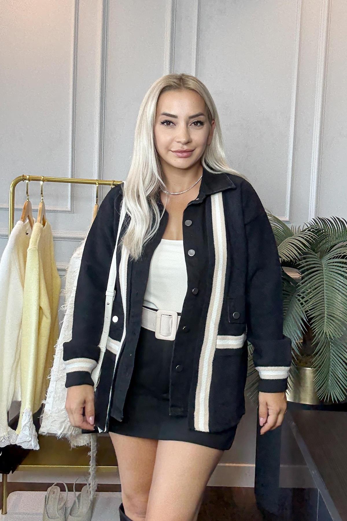 Siyah Triko Detaylı Önden Düğmeli Kadın Ceket